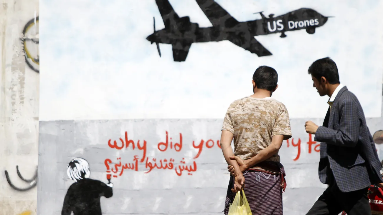 A yemini man looks at a graffiti protesting against US drone operations in Sanata Yemen. April 2014. Reports state Yemen has issued a temporary ban on US military drone strikes in de country following a drone strike that hit a wedding convey in December 2013, killing 13 Yemeni civilians and wounding 21 others. The US …